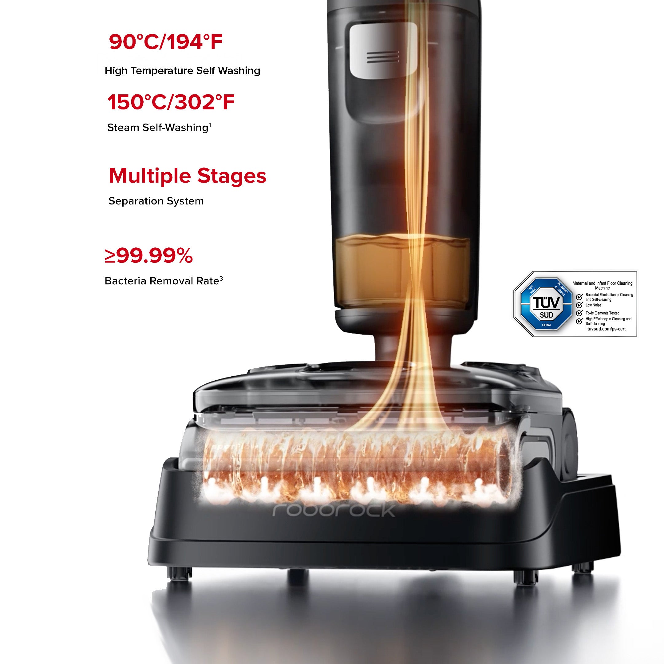 Using Steam and high temperature to deep-clean the roller with advanced solid-liquid-air separation technology, while the DirTect module senses dirt levels and automatically adjusts the cleaning power-keeping the roller fresh and spotless.